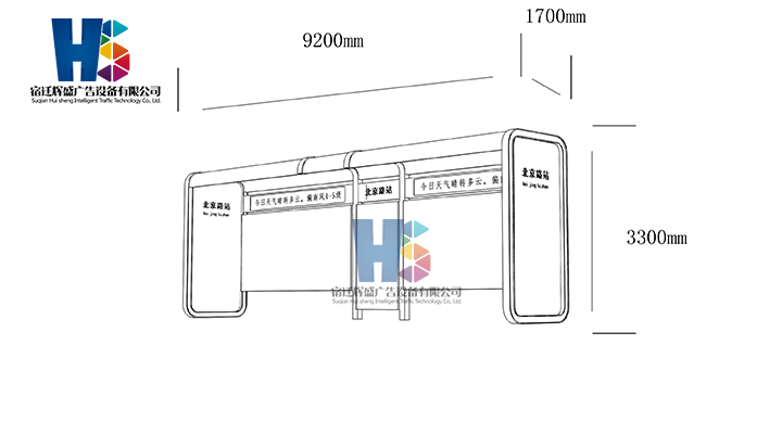 產(chǎn)品外觀 / PRODUCT DETAILS 產(chǎn)品信息 / PRODUCT INFO 【產(chǎn)品名稱】:新款候車亭HS66 【產(chǎn)品系列】:新款候車亭 【產(chǎn)品型號(hào)】:HS66 【產(chǎn)品規(guī)格】:長(zhǎng)9200mm 寬1700mm 高3300mm 【產(chǎn)品材質(zhì)】:熱鍍鋅鋼板 【使用年限】:10-15年 【詳情致電】:181-5189-0417、157-5170-8886 備注:產(chǎn)品可根據(jù)用戶需求選用材質(zhì)、顏色及配件,個(gè)性化定制。 1、表面采用靜電噴塑(氟碳烤漆/搪瓷處理) 2、頂棚采用100*100*1.5mm、100*150*2mm鍍鋅管,3mm鍍鋅板激光切割件、1.5mm鍍鋅板焊接骨架,鋪1mm鍍鋅板(10mm陽(yáng)光板) 3、立柱采用150*150*3mm鍍鋅管 4、箱體采用1.5mm鍍鋅板折彎焊接成型,門(mén)框采用全玻鋁合金型材,視窗采用6mm鋼化玻璃 5、照明電器采用LED燈粒 產(chǎn)品尺寸 / PRODUCT SIZE 關(guān)于輝盛 / 為社會(huì)分擔(dān)責(zé)任,為客戶創(chuàng)造價(jià)值 宿遷輝盛廣告設(shè)備有限公司是一家集設(shè)計(jì)、研發(fā)、生產(chǎn)為一體的城市公共設(shè)施生產(chǎn)型企業(yè)。主要產(chǎn)品有:候車公交亭、公交站臺(tái)、閱報(bào)欄、路名牌、垃圾箱、燈箱等市政設(shè)施系列產(chǎn)品和工程配套設(shè)施系列產(chǎn)品,現(xiàn)有高級(jí)技師30多人,高級(jí)職稱設(shè)計(jì)人員10人,是一家具有自主開(kāi)發(fā)和設(shè)計(jì)能力的以公交亭、智能公交為主導(dǎo)的綜合性城市公共設(shè)施制造企業(yè)。為了進(jìn)一步改善生產(chǎn)工藝,提高產(chǎn)品質(zhì)量,公司引進(jìn)了先進(jìn)生產(chǎn)設(shè)備,包括立臥式加工中心,工業(yè)涂裝流水線,CNC車床,線切割機(jī),大型數(shù)控板機(jī),數(shù)控折邊機(jī),數(shù)控沖孔機(jī)床,大型折彎?rùn)C(jī)等。公司還專門(mén)成立了產(chǎn)品研發(fā)部門(mén),現(xiàn)每年自主開(kāi)發(fā)或應(yīng)客戶要求設(shè)計(jì)推出多款新產(chǎn)品。 榮譽(yù)資質(zhì) / ENTERPRISE HONOR