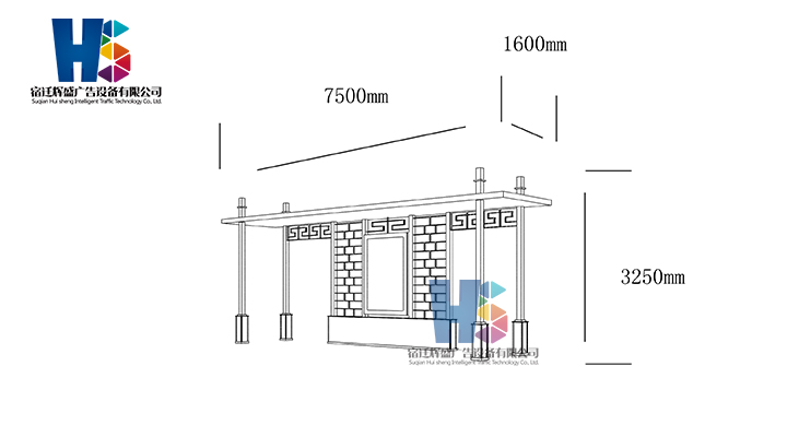 產(chǎn)品外觀 / PRODUCT DETAILS 產(chǎn)品信息 / PRODUCT INFO 【產(chǎn)品名稱】:新款候車亭HS33 【產(chǎn)品系列】:新款候車亭 【產(chǎn)品型號(hào)】:HS33 【產(chǎn)品規(guī)格】:長(zhǎng)7500mm 寬1600mm 高3250mm 【產(chǎn)品材質(zhì)】:熱鍍鋅鋼板 【使用年限】:10-15年 【詳情致電】:181-5189-0417、157-5170-8886 備注:產(chǎn)品可根據(jù)用戶需求選用材質(zhì)、顏色及配件,個(gè)性化定制。 1、表面采用靜電噴塑(氟碳烤漆/搪瓷處理) 2、頂棚采用100*100*1.5mm、100*150*2mm鍍鋅管,3mm鍍鋅板激光切割件、1.5mm鍍鋅板焊接骨架,鋪1mm鍍鋅板(10mm陽光板) 3、立柱采用150*150*3mm鍍鋅管 4、箱體采用1.5mm鍍鋅板折彎焊接成型,門框采用全玻鋁合金型材,視窗采用6mm鋼化玻璃 5、照明電器采用LED燈粒 產(chǎn)品尺寸 / PRODUCT SIZE 關(guān)于輝盛 / 為社會(huì)分擔(dān)責(zé)任,為客戶創(chuàng)造價(jià)值 宿遷輝盛廣告設(shè)備有限公司是一家集設(shè)計(jì)、研發(fā)、生產(chǎn)為一體的城市公共設(shè)施生產(chǎn)型企業(yè)。主要產(chǎn)品有:候車公交亭、公交站臺(tái)、閱報(bào)欄、路名牌、垃圾箱、燈箱等市政設(shè)施系列產(chǎn)品和工程配套設(shè)施系列產(chǎn)品,現(xiàn)有高級(jí)技師30多人,高級(jí)職稱設(shè)計(jì)人員10人,是一家具有自主開發(fā)和設(shè)計(jì)能力的以公交亭、智能公交為主導(dǎo)的綜合性城市公共設(shè)施制造企業(yè)。為了進(jìn)一步改善生產(chǎn)工藝,提高產(chǎn)品質(zhì)量,公司引進(jìn)了先進(jìn)生產(chǎn)設(shè)備,包括立臥式加工中心,工業(yè)涂裝流水線,CNC車床,線切割機(jī),大型數(shù)控板機(jī),數(shù)控折邊機(jī),數(shù)控沖孔機(jī)床,大型折彎?rùn)C(jī)等。公司還專門成立了產(chǎn)品研發(fā)部門,現(xiàn)每年自主開發(fā)或應(yīng)客戶要求設(shè)計(jì)推出多款新產(chǎn)品。 榮譽(yù)資質(zhì) / ENTERPRISE HONOR