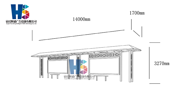 產(chǎn)品外觀 / PRODUCT DETAILS 產(chǎn)品信息 / PRODUCT INFO 【產(chǎn)品名稱】:新款候車亭HS31 【產(chǎn)品系列】:新款候車亭 【產(chǎn)品型號】:HS31 【產(chǎn)品規(guī)格】:長14000mm 寬1700mm 高3270mm 【產(chǎn)品材質(zhì)】:熱鍍鋅鋼板 【使用年限】:10-15年 【詳情致電】:181-5189-0417、157-5170-8886 備注:產(chǎn)品可根據(jù)用戶需求選用材質(zhì)、顏色及配件,個(gè)性化定制。 1、表面采用靜電噴塑(氟碳烤漆/搪瓷處理) 2、頂棚采用100*100*1.5mm、100*150*2mm鍍鋅管,3mm鍍鋅板激光切割件、1.5mm鍍鋅板焊接骨架,鋪1mm鍍鋅板(10mm陽光板) 3、立柱采用150*150*3mm鍍鋅管 4、箱體采用1.5mm鍍鋅板折彎焊接成型,門框采用全玻鋁合金型材,視窗采用6mm鋼化玻璃 5、照明電器采用LED燈粒 產(chǎn)品尺寸 / PRODUCT SIZE 關(guān)于輝盛 / 為社會分擔(dān)責(zé)任,為客戶創(chuàng)造價(jià)值 宿遷輝盛廣告設(shè)備有限公司是一家集設(shè)計(jì)、研發(fā)、生產(chǎn)為一體的城市公共設(shè)施生產(chǎn)型企業(yè)。主要產(chǎn)品有:候車公交亭、公交站臺、閱報(bào)欄、路名牌、垃圾箱、燈箱等市政設(shè)施系列產(chǎn)品和工程配套設(shè)施系列產(chǎn)品,現(xiàn)有高級技師30多人,高級職稱設(shè)計(jì)人員10人,是一家具有自主開發(fā)和設(shè)計(jì)能力的以公交亭、智能公交為主導(dǎo)的綜合性城市公共設(shè)施制造企業(yè)。為了進(jìn)一步改善生產(chǎn)工藝,提高產(chǎn)品質(zhì)量,公司引進(jìn)了先進(jìn)生產(chǎn)設(shè)備,包括立臥式加工中心,工業(yè)涂裝流水線,CNC車床,線切割機(jī),大型數(shù)控板機(jī),數(shù)控折邊機(jī),數(shù)控沖孔機(jī)床,大型折彎機(jī)等。公司還專門成立了產(chǎn)品研發(fā)部門,現(xiàn)每年自主開發(fā)或應(yīng)客戶要求設(shè)計(jì)推出多款新產(chǎn)品。 榮譽(yù)資質(zhì) / ENTERPRISE HONOR