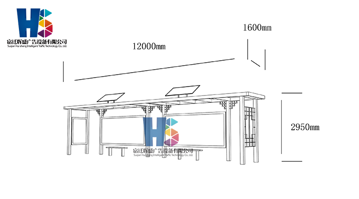 產(chǎn)品外觀 / PRODUCT DETAILS 產(chǎn)品信息 / PRODUCT INFO 【產(chǎn)品名稱】:新款候車亭HS11 【產(chǎn)品系列】:新款候車亭 【產(chǎn)品型號】:HS11 【產(chǎn)品規(guī)格】:長12000mm 寬1600mm 高2950mm 【產(chǎn)品材質(zhì)】:熱鍍鋅鋼板 【使用年限】:10-15年 【詳情致電】:181-5189-0417、157-5170-8886 備注:產(chǎn)品可根據(jù)用戶需求選用材質(zhì)、顏色及配件,個性化定制。 1、表面采用靜電噴塑(氟碳烤漆/搪瓷處理) 2、頂棚采用100*100*1.5mm、100*150*2mm鍍鋅管,3mm鍍鋅板激光切割件、1.5mm鍍鋅板焊接骨架,鋪1mm鍍鋅板(10mm陽光板) 3、立柱采用150*150*3mm鍍鋅管 4、箱體采用1.5mm鍍鋅板折彎焊接成型,門框采用全玻鋁合金型材,視窗采用6mm鋼化玻璃 5、照明電器采用LED燈粒 產(chǎn)品尺寸 / PRODUCT SIZE 關(guān)于輝盛 / 為社會分擔(dān)責(zé)任,為客戶創(chuàng)造價值 宿遷輝盛廣告設(shè)備有限公司是一家集設(shè)計、研發(fā)、生產(chǎn)為一體的城市公共設(shè)施生產(chǎn)型企業(yè)。主要產(chǎn)品有:候車公交亭、公交站臺、閱報欄、路名牌、垃圾箱、燈箱等市政設(shè)施系列產(chǎn)品和工程配套設(shè)施系列產(chǎn)品,現(xiàn)有高級技師30多人,高級職稱設(shè)計人員10人,是一家具有自主開發(fā)和設(shè)計能力的以公交亭、智能公交為主導(dǎo)的綜合性城市公共設(shè)施制造企業(yè)。為了進(jìn)一步改善生產(chǎn)工藝,提高產(chǎn)品質(zhì)量,公司引進(jìn)了先進(jìn)生產(chǎn)設(shè)備,包括立臥式加工中心,工業(yè)涂裝流水線,CNC車床,線切割機,大型數(shù)控板機,數(shù)控折邊機,數(shù)控沖孔機床,大型折彎機等。公司還專門成立了產(chǎn)品研發(fā)部門,現(xiàn)每年自主開發(fā)或應(yīng)客戶要求設(shè)計推出多款新產(chǎn)品。 榮譽資質(zhì) / ENTERPRISE HONOR