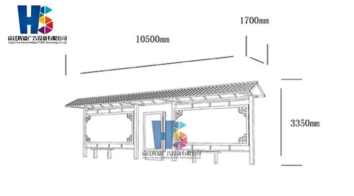 產(chǎn)品外觀 / PRODUCT DETAILS 產(chǎn)品信息 / PRODUCT INFO 【產(chǎn)品名稱】:新款候車亭HS6 【產(chǎn)品系列】:新款候車亭 【產(chǎn)品型號】:HS6 【產(chǎn)品規(guī)格】:長10500mm 寬1700mm 高3350mm 【產(chǎn)品材質(zhì)】:熱鍍鋅鋼板 【使用年限】:10-15年 【詳情致電】:181-5189-0417、157-5170-8886 備注:產(chǎn)品可根據(jù)用戶需求選用材質(zhì)、顏色及配件,個性化定制。 1、表面采用靜電噴塑(氟碳烤漆/搪瓷處理) 2、頂棚采用100*100*1.5mm、100*150*2mm鍍鋅管,3mm鍍鋅板激光切割件、1.5mm鍍鋅板焊接骨架,鋪1mm鍍鋅板(10mm陽光板) 3、立柱采用150*150*3mm鍍鋅管 4、箱體采用1.5mm鍍鋅板折彎焊接成型,門框采用全玻鋁合金型材,視窗采用6mm鋼化玻璃 5、照明電器采用LED燈粒 產(chǎn)品尺寸 / PRODUCT SIZE 關(guān)于輝盛 / 為社會分擔(dān)責(zé)任,為客戶創(chuàng)造價值 宿遷輝盛廣告設(shè)備有限公司是一家集設(shè)計、研發(fā)、生產(chǎn)為一體的城市公共設(shè)施生產(chǎn)型企業(yè)。主要產(chǎn)品有:候車公交亭、公交站臺、閱報欄、路名牌、垃圾箱、燈箱等市政設(shè)施系列產(chǎn)品和工程配套設(shè)施系列產(chǎn)品,現(xiàn)有高級技師30多人,高級職稱設(shè)計人員10人,是一家具有自主開發(fā)和設(shè)計能力的以公交亭、智能公交為主導(dǎo)的綜合性城市公共設(shè)施制造企業(yè)。為了進一步改善生產(chǎn)工藝,提高產(chǎn)品質(zhì)量,公司引進了先進生產(chǎn)設(shè)備,包括立臥式加工中心,工業(yè)涂裝流水線,CNC車床,線切割機,大型數(shù)控板機,數(shù)控折邊機,數(shù)控沖孔機床,大型折彎機等。公司還專門成立了產(chǎn)品研發(fā)部門,現(xiàn)每年自主開發(fā)或應(yīng)客戶要求設(shè)計推出多款新產(chǎn)品。 榮譽資質(zhì) / ENTERPRISE HONOR