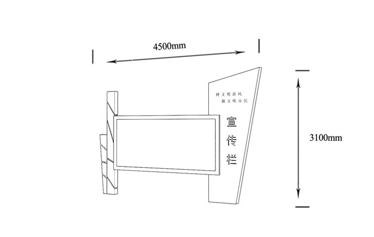 產(chǎn)品外觀 / PRODUCT DETAILS 產(chǎn)品信息 / PRODUCT INFO 【產(chǎn)品名稱】:宣傳欄XCL5-1 【產(chǎn)品系列】:宣傳欄 【產(chǎn)品型號(hào)】:XCL5-1 【產(chǎn)品規(guī)格】:長(zhǎng)4500mm高3100mm 【產(chǎn)品材質(zhì)】:熱鍍鋅鋼板 【使用年限】:10-15年 【詳情致電】:181-5189-0417、157-5170-8886 備注:產(chǎn)品可根據(jù)用戶需求選用材質(zhì)、顏色及配件,個(gè)性化定制。 1、表面采用靜電噴塑(氟碳烤漆/搪瓷處理) 2、頂棚采用100*100*1.5mm、100*150*2mm鍍鋅管,3mm鍍鋅板激光切割件、1.5mm鍍鋅板焊接骨架,鋪1mm鍍鋅板(10mm陽(yáng)光板) 3、立柱采用150*150*3mm鍍鋅管 4、箱體采用1.5mm鍍鋅板折彎焊接成型,門框采用全玻鋁合金型材,視窗采用6mm鋼化玻璃 5、照明電器采用LED燈粒 產(chǎn)品尺寸 / PRODUCT SIZE 關(guān)于輝盛 / 為社會(huì)分擔(dān)責(zé)任,為客戶創(chuàng)造價(jià)值 宿遷輝盛廣告設(shè)備有限公司是一家集設(shè)計(jì)、研發(fā)、生產(chǎn)為一體的城市公共設(shè)施生產(chǎn)型企業(yè)。主要產(chǎn)品有:候車公交亭、公交站臺(tái)、閱報(bào)欄、路名牌、垃圾箱、燈箱等市政設(shè)施系列產(chǎn)品和工程配套設(shè)施系列產(chǎn)品,現(xiàn)有高級(jí)技師30多人,高級(jí)職稱設(shè)計(jì)人員10人,是一家具有自主開(kāi)發(fā)和設(shè)計(jì)能力的以公交亭、智能公交為主導(dǎo)的綜合性城市公共設(shè)施制造企業(yè)。為了進(jìn)一步改善生產(chǎn)工藝,提高產(chǎn)品質(zhì)量,公司引進(jìn)了先進(jìn)生產(chǎn)設(shè)備,包括立臥式加工中心,工業(yè)涂裝流水線,CNC車床,線切割機(jī),大型數(shù)控板機(jī),數(shù)控折邊機(jī),數(shù)控沖孔機(jī)床,大型折彎?rùn)C(jī)等。公司還專門成立了產(chǎn)品研發(fā)部門,現(xiàn)每年自主開(kāi)發(fā)或應(yīng)客戶要求設(shè)計(jì)推出多款新產(chǎn)品。 榮譽(yù)資質(zhì) / ENTERPRISE HONOR