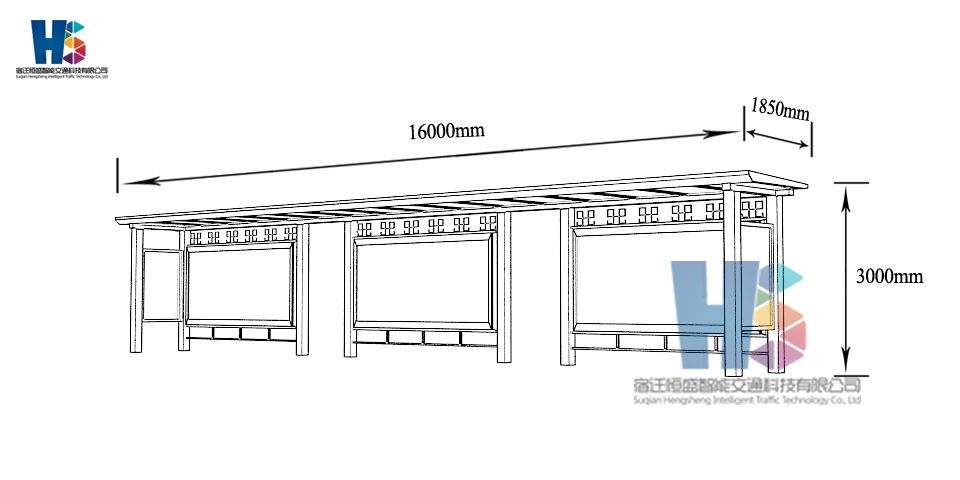 產(chǎn)品外觀 / PRODUCT DETAILS 產(chǎn)品信息 / PRODUCT INFO 【產(chǎn)品名稱】:中式古典候車亭GD15 【產(chǎn)品系列】:中式古典候車亭 【產(chǎn)品型號】:GD15 【產(chǎn)品規(guī)格】:長10800mm 寬1700mm 高2900mm 【產(chǎn)品材質(zhì)】:熱鍍鋅鋼板 【使用年限】:10-15年 【詳情致電】:181-5189-0417、157-5170-8886 備注:產(chǎn)品可根據(jù)用戶需求選用材質(zhì)、顏色及配件,個性化定制。 1、表面采用靜電噴塑(氟碳烤漆/搪瓷處理) 2、頂棚采用100*100*1.5mm、100*150*2mm鍍鋅管,3mm鍍鋅板激光切割件、1.5mm鍍鋅板焊接骨架,鋪1mm鍍鋅板(10mm陽光板) 3、立柱采用150*150*3mm鍍鋅管 4、箱體采用1.5mm鍍鋅板折彎焊接成型,門框采用全玻鋁合金型材,視窗采用6mm鋼化玻璃 5、照明電器采用LED燈粒 產(chǎn)品尺寸 / PRODUCT SIZE 關(guān)于輝盛 / 為社會分擔(dān)責(zé)任,為客戶創(chuàng)造價值 宿遷輝盛廣告設(shè)備有限公司是一家集設(shè)計、研發(fā)、生產(chǎn)為一體的城市公共設(shè)施生產(chǎn)型企業(yè)。主要產(chǎn)品有:候車公交亭、公交站臺、閱報欄、路名牌、垃圾箱、燈箱等市政設(shè)施系列產(chǎn)品和工程配套設(shè)施系列產(chǎn)品,現(xiàn)有高級技師30多人,高級職稱設(shè)計人員10人,是一家具有自主開發(fā)和設(shè)計能力的以公交亭、智能公交為主導(dǎo)的綜合性城市公共設(shè)施制造企業(yè)。為了進(jìn)一步改善生產(chǎn)工藝,提高產(chǎn)品質(zhì)量,公司引進(jìn)了先進(jìn)生產(chǎn)設(shè)備,包括立臥式加工中心,工業(yè)涂裝流水線,CNC車床,線切割機,大型數(shù)控板機,數(shù)控折邊機,數(shù)控沖孔機床,大型折彎機等。公司還專門成立了產(chǎn)品研發(fā)部門,現(xiàn)每年自主開發(fā)或應(yīng)客戶要求設(shè)計推出多款新產(chǎn)品。 榮譽資質(zhì) / ENTERPRISE HONOR