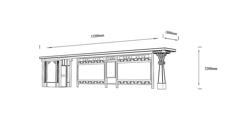 產品外觀 / PRODUCT DETAILS 產品信息 / PRODUCT INFO 【產品名稱】:中式古典候車亭GD1 【產品系列】:中式古典候車亭 【產品型號】:GD1 【產品規(guī)格】:長10800mm 寬1700mm 高2900mm 【產品材質】:熱鍍鋅鋼板 【使用年限】:10-15年 【詳情致電】:181-5189-0417、157-5170-8886 備注:產品可根據用戶需求選用材質、顏色及配件,個性化定制。 1、表面采用靜電噴塑(氟碳烤漆/搪瓷處理) 2、頂棚采用100*100*1.5mm、100*150*2mm鍍鋅管,3mm鍍鋅板激光切割件、1.5mm鍍鋅板焊接骨架,鋪1mm鍍鋅板(10mm陽光板) 3、立柱采用150*150*3mm鍍鋅管 4、箱體采用1.5mm鍍鋅板折彎焊接成型,門框采用全玻鋁合金型材,視窗采用6mm鋼化玻璃 5、照明電器采用LED燈粒 產品尺寸 / PRODUCT SIZE 關于輝盛 / 為社會分擔責任,為客戶創(chuàng)造價值 宿遷輝盛廣告設備有限公司是一家集設計、研發(fā)、生產為一體的城市公共設施生產型企業(yè)。主要產品有:候車公交亭、公交站臺、閱報欄、路名牌、垃圾箱、燈箱等市政設施系列產品和工程配套設施系列產品,現有高級技師30多人,高級職稱設計人員10人,是一家具有自主開發(fā)和設計能力的以公交亭、智能公交為主導的綜合性城市公共設施制造企業(yè)。為了進一步改善生產工藝,提高產品質量,公司引進了先進生產設備,包括立臥式加工中心,工業(yè)涂裝流水線,CNC車床,線切割機,大型數控板機,數控折邊機,數控沖孔機床,大型折彎機等。公司還專門成立了產品研發(fā)部門,現每年自主開發(fā)或應客戶要求設計推出多款新產品。 榮譽資質 / ENTERPRISE HONOR